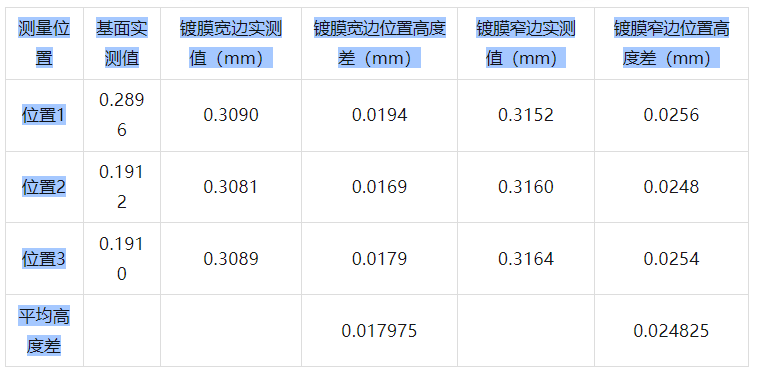 1. 经过测量,圆形样品的镀膜厚度为0.0156mm,长形样品的宽边镀膜厚度为0.018mm,窄边镀膜厚度为0.0248mm2.在实际测量中建议使用伺服控制载物移动平台,可以减小因测量轨迹变化和样品本身的翘曲度带来的测量误差